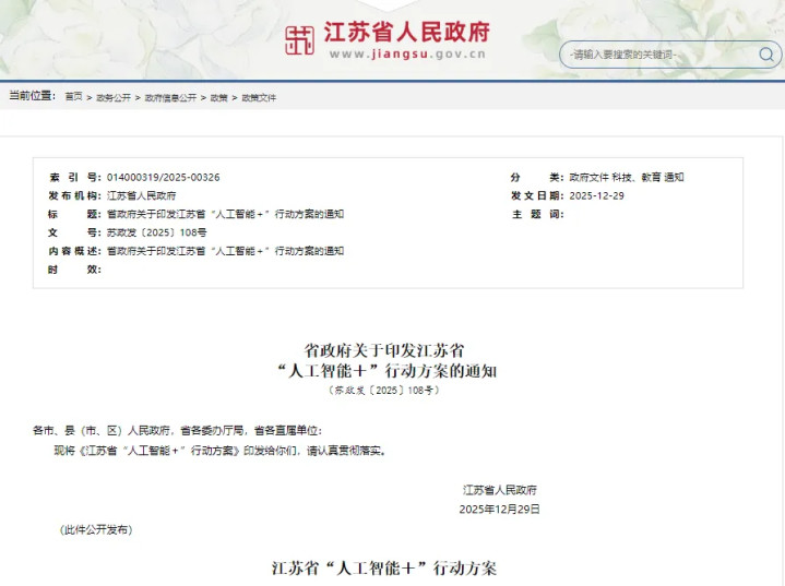 近日,江苏省政府印发《江苏省“人工智能+”行动方案》。