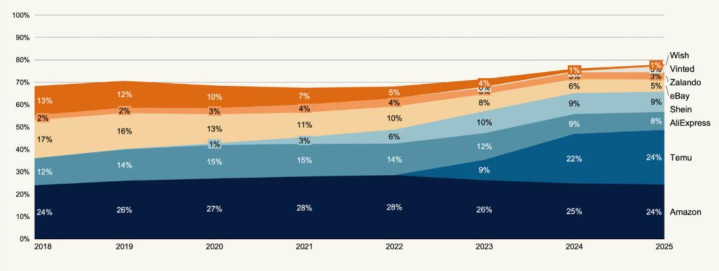 除了Temu外,排名第三的SHEIN市场份额维持在9%,速卖通则为8%。