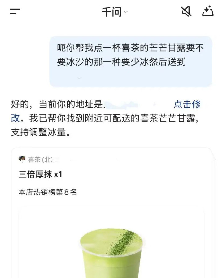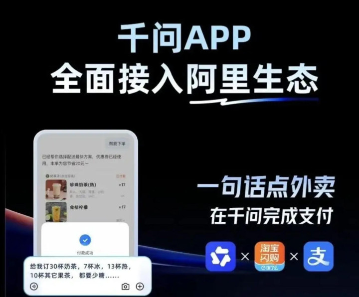 1月15日,千问App宣布全面融入淘宝、支付宝、淘宝闪购、飞猪、高德等阿里生态业务,并向全体用户开放测试。用户只需在聊天框说:“帮我点杯奶茶”或“帮我点两杯咖啡”,千问便能运用淘宝闪购的服务功能,精确定位,推荐适宜的商家,创建订单,并借助内置的“支付宝AI付”功能一键完成支付。在用户授权的前提下,整个支付环节可直接在千问对话界面内完成,无需跳转至其他应用。科幻中的“说一句,就送到”的效果,已经变为现实。