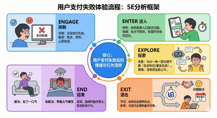 场景定义好了,我们就要钻进去,看看这个场景里的用户,他到底想干嘛,他的情绪是怎么变化的。这里可以用JTBD理论去挖他要完成的核心任务,用5E模型去描绘他的体验地图。他从接触到我们的产品,到完成任务,再到结束离开,整个过程是开心的,还是焦虑的,还是沮丧的。这些洞察是后面做决策的情感基础。
