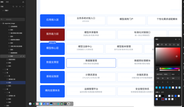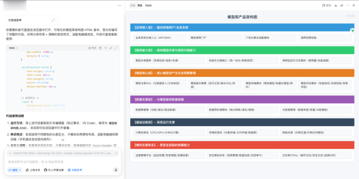 比如下边的,我临时需要个架构图,让AI生成文字版后,然后让AI通过html生成,接着就出来: