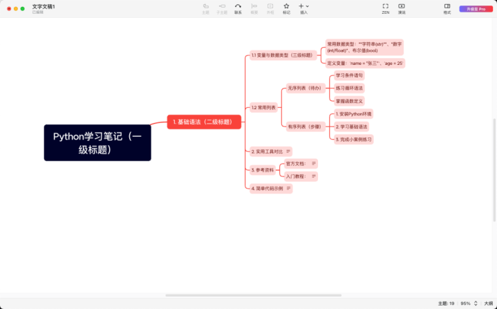 通过“导入–Markdown”,Xmind会直接解析层级关系,转成思维导图展示出来。