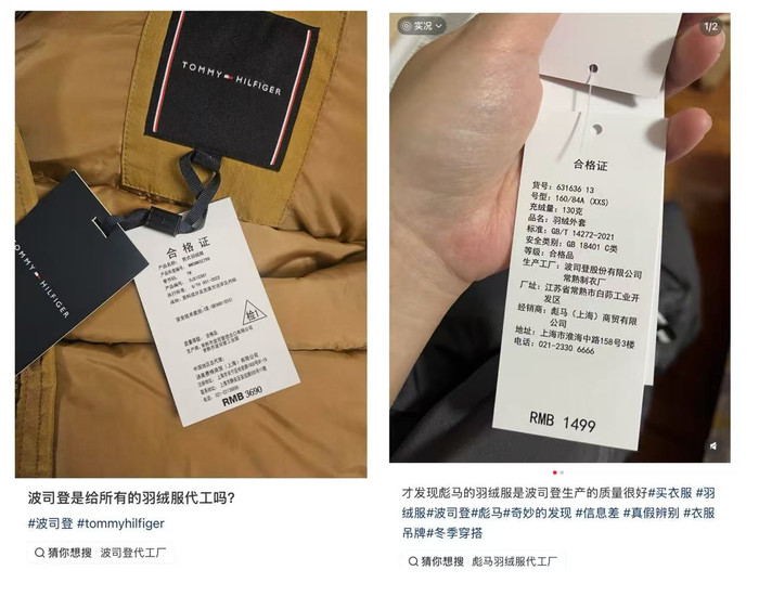1月19日,界面新闻查阅小红书等社交平台发现,确实有网友发类似帖子。还有不少网友晒出的相关吊牌显示,波司登还为其他国际服装品牌代工。界面新闻查询天猫CalvinKlein官方旗舰店,其男女款羽绒服售价1300到3000元不等。