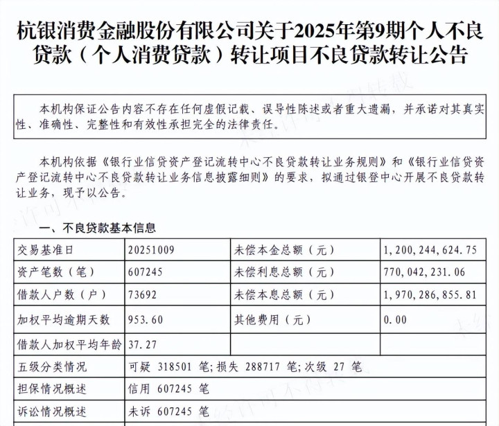 转让超19亿不良资产。2025年11月,杭州银行旗下杭银消费金融股份有限公司披露2025年第9期个人不良贷款(个人消费贷款)转让公告,未偿本息总额19.7亿元,涉及607245笔资产,借款人共73692户。