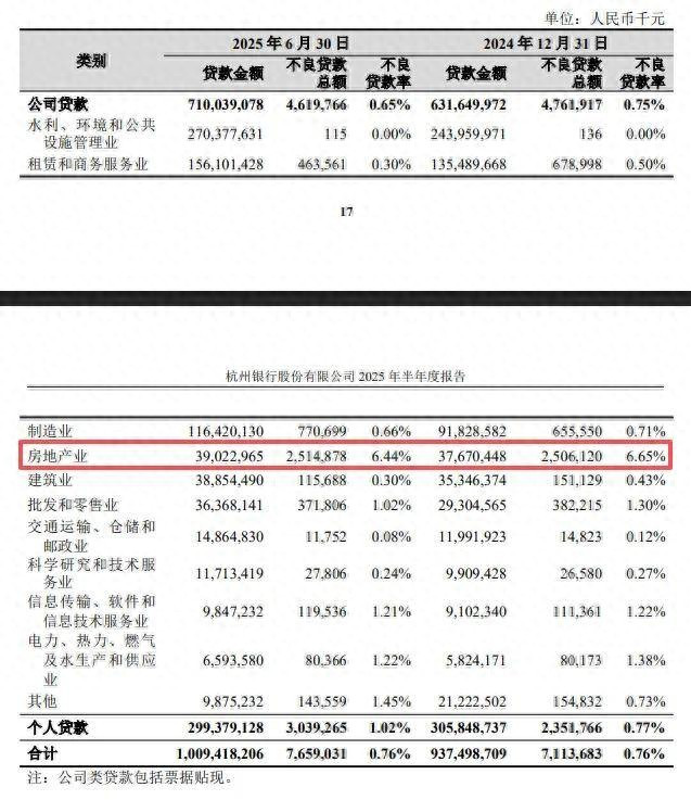房地产业不良贷款超25亿元。2025年中报显示,杭州银行对公不良贷款46.12亿元、不良贷款0.65%,较上年末分别减少1.42亿元、下滑0.1个百分点。进一步来看,对公不良贷款主要集中在房地产业,金额高达25.15亿元,不良贷款率高达6.44%。
