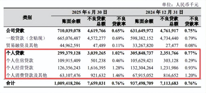 个人不良双增。不同于对公贷款不良双降,杭州银行个人不良贷款上升较为明显,2025年中报为30.39亿元、不良贷款率为1.02%,较上年末增加6.87亿元、上升0.25个百分点。