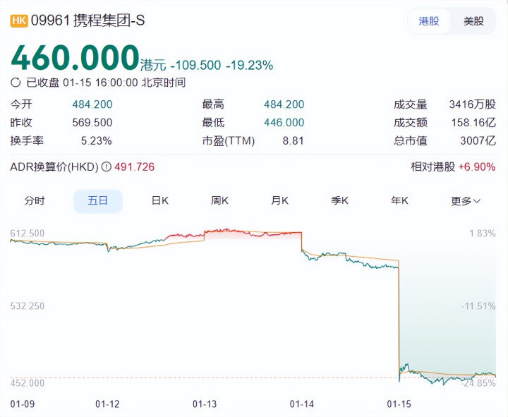 1月13日,携程港股刚刚触达613港元/股的历史峰值。14日,携程港股就直线下跌,收盘跌超6%;今天携程港股依然重挫,一度跌超20%,截至收盘,跌19.23%,报收460港元/股,最新市值3007亿港元,两日市值蒸发近1000亿港元。