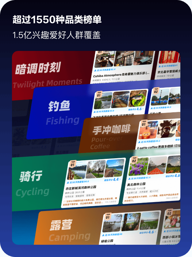 具体统计方法是,高德基于10亿用户日均2.9亿的行为序列,生成全球首创的基于季节与地域特征自动演化的生活服务榜单,如在冬天提供滑雪场榜单,春天提供踏青榜单,夏天避暑榜单,秋天赏红叶榜单等等。