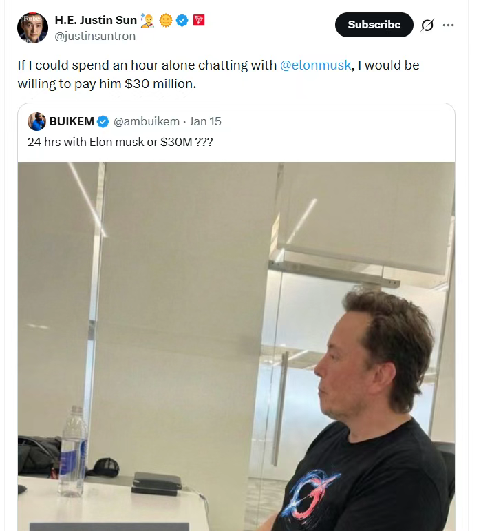 近日,90后币圈大佬孙宇晨在X上发帖表示,如果能和马斯克单独聊一个小时,他愿意支付3000万美元。算下来,马斯克每秒可进账8333美元。不过,截至目前,这条消息尚未得到马斯克的回复。