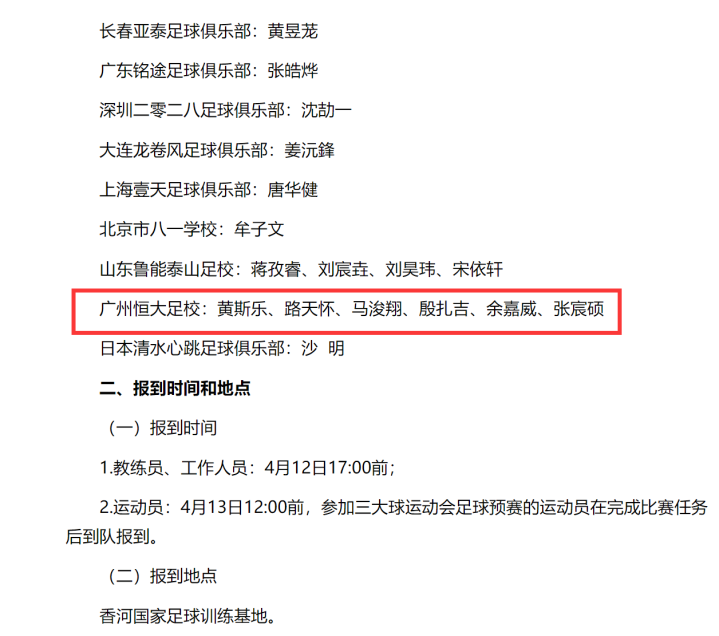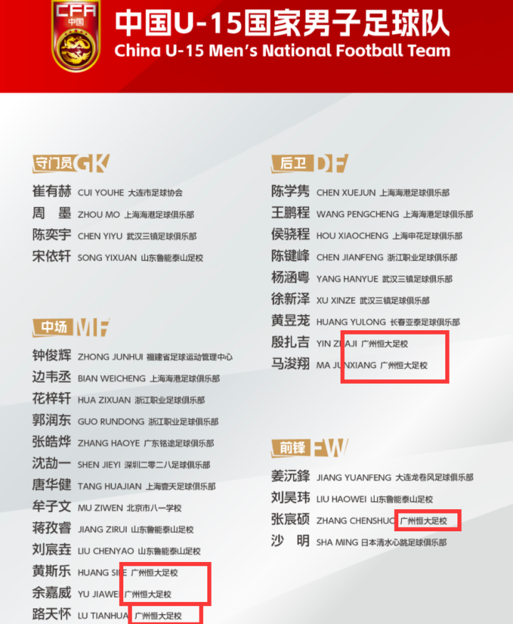 而报名参加的中国队球员名单上,来自恒大足校的8名小将榜上知名:黄斯乐、路天怀、马浚翔、殷扎吉、余嘉威、张宸硕、唐华健、杨涵粤。而更让精深老球迷蓦地破防的,是中国足协在球员包摄标注栏中,将其中6位球员的开头地明晰写为——“广州恒大”。
