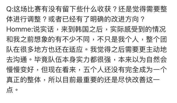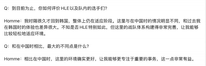 而在去年12月时,Homme曾在采访中表示:我时隔很久才回到韩国,整体上仍在适应阶段。这里与在中国时的情况明显不同,和过去我在韩国时的体验也差异很大。不知是否HLE特别如此,但这里的战队体系构建得非常完善,让我能够比较轻松地适应环境。