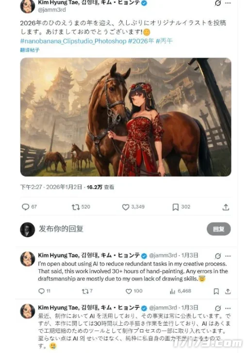这番说辞看似很迷惑,实际上也是韩游厂商准备用AI来降低成本的一个行业普遍行为,在年初那几天他发的一张马年贺图就被网友扒出是AI生成的,瑕疵相当明显。