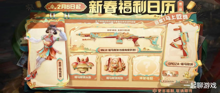 接下来出场的是第二弹的新春福利,从2.6开始,陆续出场的是新套装“福马献瑞”、5级MK14、头盔、背包、Groza、挂件、降落伞。