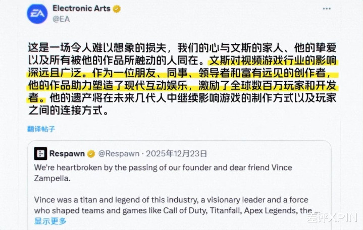 APEX、使命召唤、战地的制作人,也是重生娱乐工作室的负责人 —— 文斯·赞佩拉,于 2025 年 12 月 21 日,不幸因车祸去世,一位游戏界的泰坦,就此陨落。