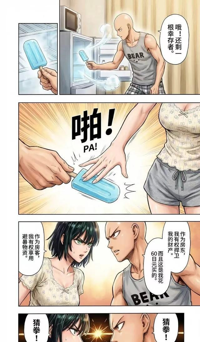 最绝的就是那个“冰棒名场面”。吹雪姐,平时多高傲一御姐,穿着精致长裙跑来埼玉那个家徒四壁的公寓,就为了蹭个空调。俩人猜拳决定最后半根冰棒,吹雪赢了,正得意呢,手一滑,冰棒直接掉地上了。你猜埼玉什么反应?他看了一眼,一脸平静地说:“浪费粮食是可耻的。”然后,弯腰,捡起来,吹了吹灰,塞嘴里吃了。整个过程行云流水,仿佛吃掉的是超市打折的豆芽菜,而不是美女掉在地上的冰棒。评论都炸了,说这是“直球克傲娇的终极形态”,埼玉老师用最朴素的价值观,完成了最高难度的撩妹操作,关键他自己还毫无自觉。吹雪那瞬间的表情,从震惊到羞恼再到一种“我到底在期待什么”的麻木,被AI刻画得淋漓尽致,那种反差感,比看一百集恋爱番都上头。