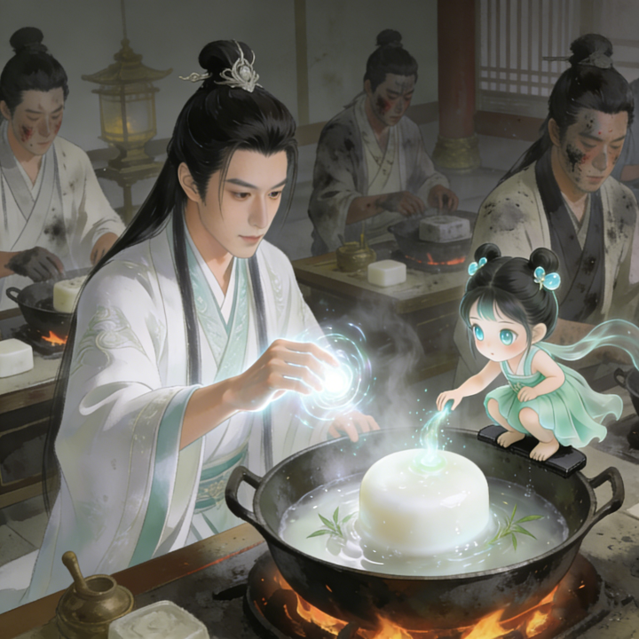 炼洁台旁,李相亭凝神静气,指尖萦绕着莹白净元灵力,精准把控着炼锅火候,锅内混合物在灵力滋养下缓缓凝结,渐成一枚圆润的莹白皂体,裹挟着醇厚的草木清香漫溢开来。小皂灵蹲在锅沿,浅绿色裙摆随气流轻晃,一双琉璃般的眼眸紧盯着皂体,不时探出小手补一缕净脂灵力,将皂体深处残留的微尘杂质彻底消融。反观周遭参赛者,不少人炼出的凝脂皂表面泛着灰黑污渍,正是被原料中隐藏的浊魂水污染所致,个个满脸焦灼,手足无措。