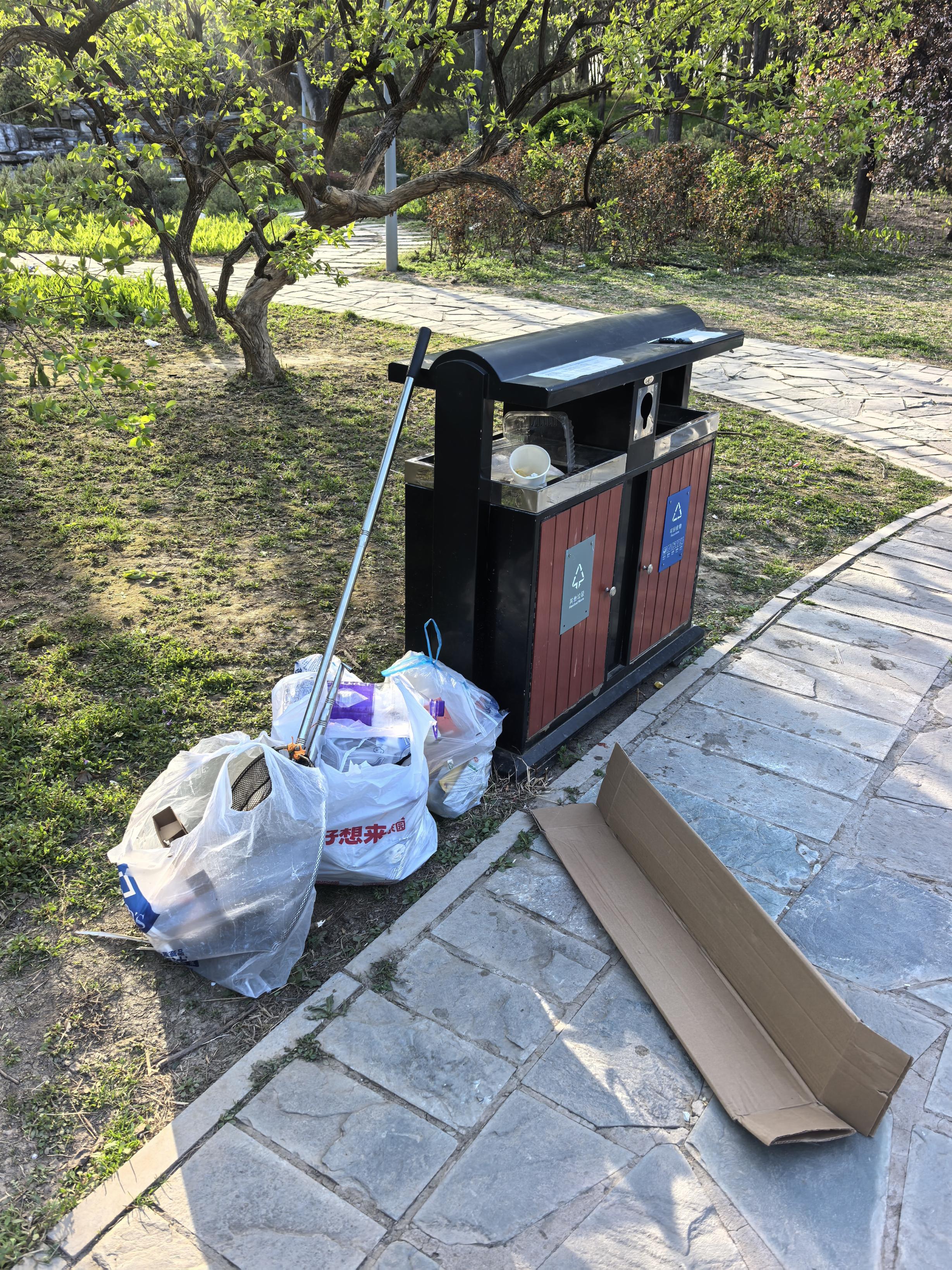 马家湾湿地公园垃圾桶满冒。