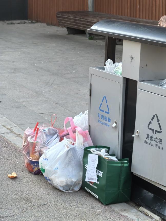 只见一位旅客手里拎着两大袋饱读饱读囊囊的垃圾,试着将垃圾袋从短促的投放口往里塞,可袋子一角刚塞进去,另一角就被卡住,用劲按压也没法皆备塞进桶内。尝试几次都没能成效,她只有将垃圾袋拿出来,放在桶边的大地上。