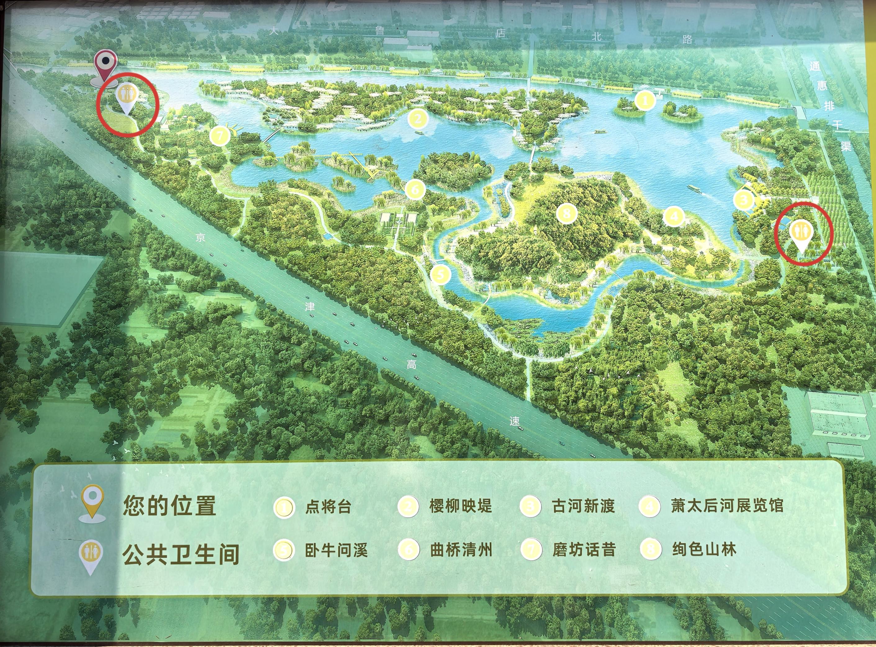马家湾湿地公园仅有两个环球卫生间,二者之间走路距离约1.6公里