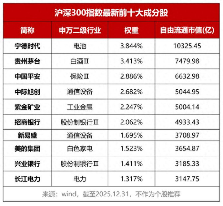 不用在5000多只股票里纠结该买哪一只。一次买入,就拥有了中国最具有代表性的300家上市公司,包括各行各业的领头企业宁德时代、贵州茅台、中国平安、中际旭创、紫金矿业等等。