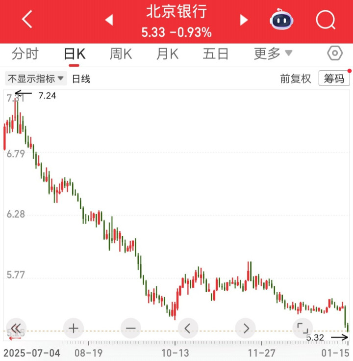 北京银行,去年7月10号股价涨到7.24元,之后一路跌到5.42元,3个月的时间跌幅21%。跌的虽然不算多,但是每天温水煮青蛙,真的让人很绝望呀。不知道有持仓的散户,心里啥感受。