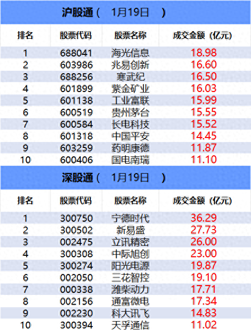 从沪股通前十大成交个股来看,海光信息位居首位;兆易创新和寒武纪分居二、三位。