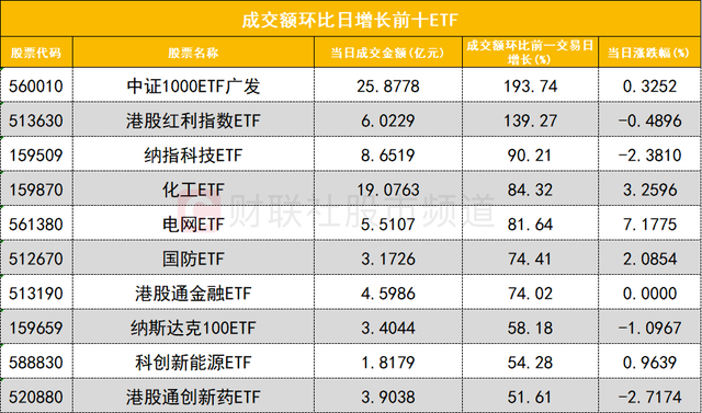 从成交额环比增长前十的ETF来看,中证1000ETF广发(560010)成交额环比增长193%位居首位;港股红利指数ETF(513630)成交额环比增长139%位居次席。