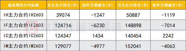四大期指主力合约中,IH、IF、IM合约多空双方均减仓,IM合约多头减仓数量较多。IC合约多空双方加仓。。