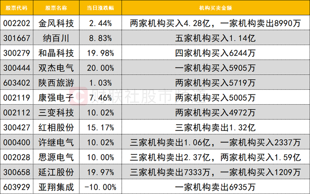 卖出方面,红相股份遭三家机构卖出1.32亿。电网设备概念今日爆发,其中思源电气遭三家机构卖出2.37亿,同时获两家机构买入1.59亿;许继电气遭三家机构卖出1.06亿。