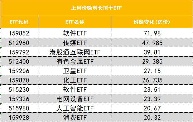 在上周份额增长前十ETF中,软件ETF(159852)上周份额增长71.98亿份位居首位;传媒ETF(512980)上周份额增长47.985亿份位居次席。