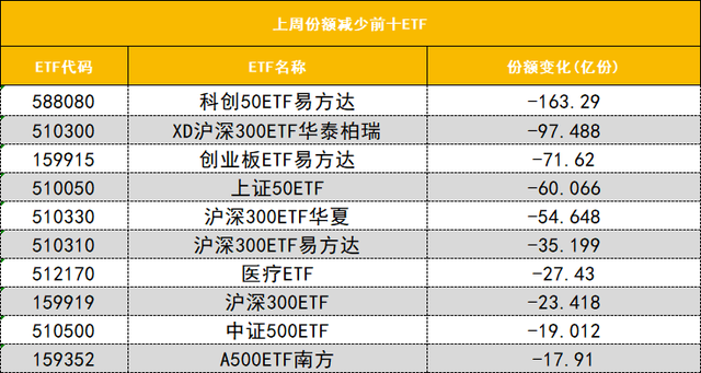 在上周份额减少前十的ETF中,多只沪深300相关ETF份额大幅减少,其中XD沪深300ETF华泰柏瑞(510300)上周份额减少97.488亿份位居首位;沪深300ETF华夏(510330)上周份额减少54.648亿份;沪深300ETF易方达(510310)上周份额减少35.199亿份;沪深300ETF(159919)上周份额减少23.418亿份。