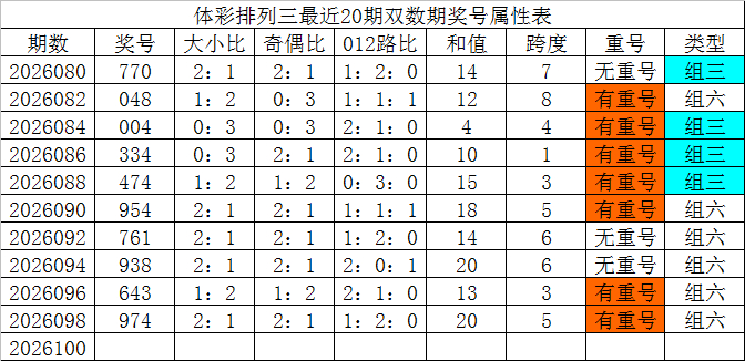 体彩陈列三最近20期双数期奖号鉴别为:770、048、004、334、474、954、761、938、643、974,各期奖号详备属性下表: