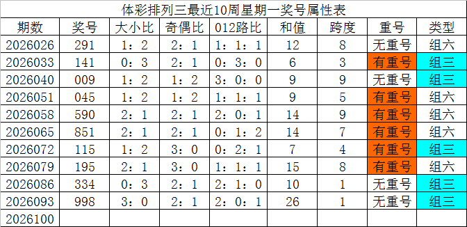 体彩陈列三最近10周星期一奖号鉴别为:291、141、009、045、590、851、115、195、334、998,各奖号属性详见下表: