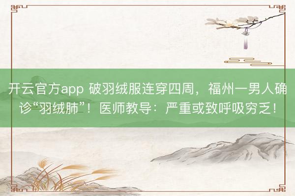 开云官方app 破羽绒服连穿四周,福州一男人确诊“羽绒肺”!医师教导:严重或致呼吸穷乏!一件有摧毁的衣服 连着穿了四周 吸入呼吸谈的羽绒纤维 竟差点导致呼吸穷乏? 近日,福州市民王先生 因呼吸贫窭就医 查验发现其血氧充足度已低至85% 并最终被确诊为 肺泡吸入羽绒导致的过敏性 俗称“羽绒肺” 破羽绒服竟成冬季“健康杀手” 王先生称,本年元旦后,一件内衬摧毁的羽绒服被我方连着穿了四周,险些每天皆衣服10小时。“因为每