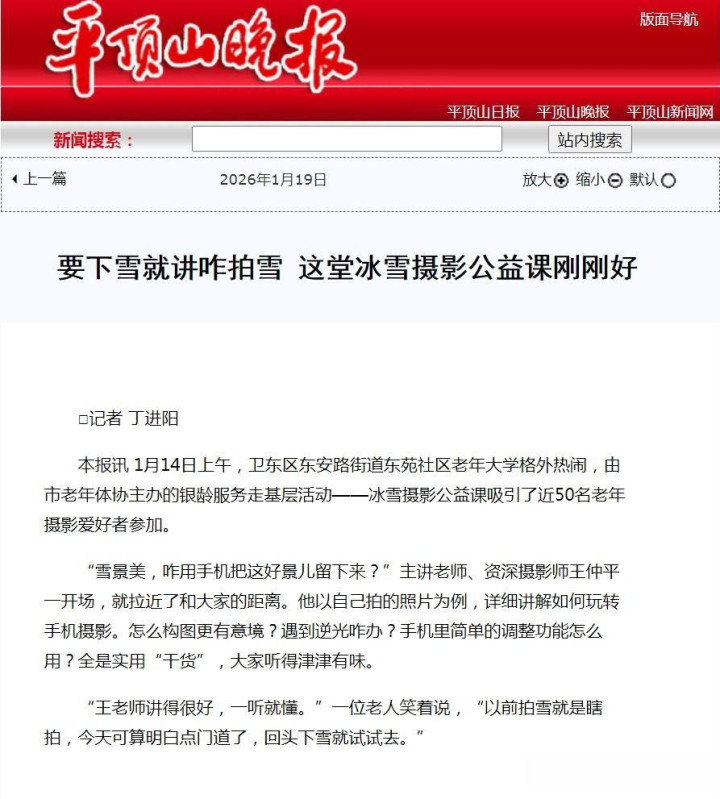 “王老师讲得很好,一听就懂。”一位老人笑着说,“以前拍雪就是瞎拍,今天可算明白点门道了,回头下雪就试试去。”